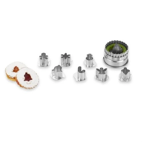 Ces 8 emporte-pièces et 8 décors interchangeables Linzertarte sont parfaits pour préparer de délicieux biscuits de Noël. Les 8 décors à placer à l’intérieur du découpoir permettent d’obtenir des formes amusantes et festives (cloche, flocons de neige, ange…). Ainsi, il suffit de presser la pâte à l’aide du poussoir et de l’extraire facilement, avant cuisson.