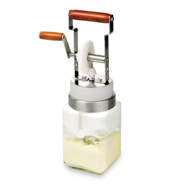 La baratte à beurre vous permet de confectionner vous-même votre beurre, et ce en un minimum de temps. Il vous suffit de verser la crème dans le bocal en verre et de tourner la manivelle. La baratte à beurre est démontable, pour un nettoyage plus facile, et est livrée avec un recueil de recettes. Caractéristiques techniques : Inox, verre et poignées bois.