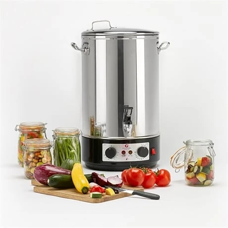 Stérilisez, cuisez, réchauffez ou encore servez des boissons chaudes grâce au bouilleur électrique 32 L pour 10 bocaux. Avec sa grande capacité de 32 L vous pourrez stériliser jusqu’à 10 bocaux simultanément. Sa cuve en acier inoxydable est adaptée au contact alimentaire, qui vous permettra de réaliser des plats en grande quantité ou des boissons chaudes. Fourni avec une colonne intérieure et 6 ressorts de maintien pour fixer les bocaux et ainsi éviter qu’ils ne bougent pendant la stérilisation.