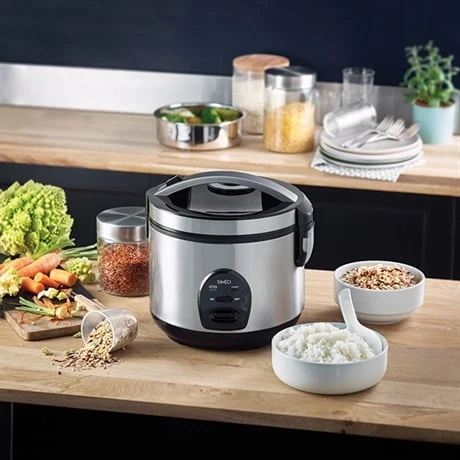 Pour une cuisine qui reste propre, l’eau de condensation est récoltée dans un collecteur amovible et votre couvercle est articulé. Par conséquent votre plan de travail est protégé des salissures. Pour un riz moelleux à souhait, une valve à vapeur amovible régule la quantité de vapeur et garanti un riz moelleux. Démontable, le nettoyage est facilité et un bouton central On/Off vous assure une utilisation en toute sécurité, notamment sans risque de mise en route intempestive.