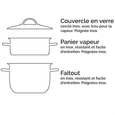 | Matière faitout et panier vapeur | inox 18/8, finition brossée |