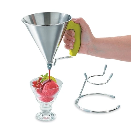 L’entonnoir à piston De Buyer vous permet de décorer vos assiettes, garnir vos mignardises et choux pâtissiers, remplir vos verrines avec précision, etc. Vous pouvez régler le débit de l’entonnoir directement sur la poignée, pour un dosage précis.
