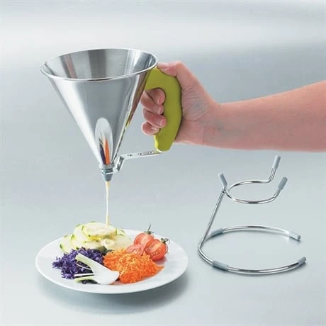 L’entonnoir est doté d’un support inox et silicone pour poser votre ustensile en cours de réalisation ou lors de son remplissage. Sa poignée ergonomique en polyamide assure une bonne prise en main. L’entonnoir à piston passe au lave-vaisselle.