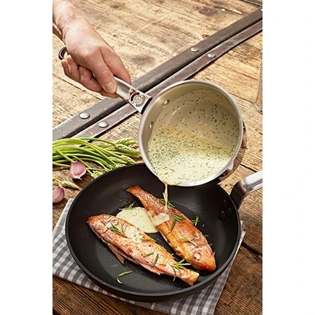 Avec cette Poêle de 24 cm de diamètre cuisinez sans colorer vos poissons, légumes, céréales…Idéale pour réchauffer des plats cuisinés ou préparer des sauces, tout en conservant le goût et la couleur des ingrédients. Avec son corps en aluminium forgée, qui garantie une montée progressive et uniforme de la température. Son revêtement en noire mat est très résistant. Cuisinez plus sainement en utilisant moins de matières grasses. Avec son revêtement renforcé sur base dure, elle permet de conserver plus longtemps ses propriétés antiadhésives (50% de durée de vie en plus). En aluminium forgé et avec sa queue rivetée en inox, cette poêle saura résister aux multiples utilisations.
