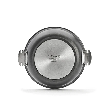 La poêle est dotée de 2 embases solidement rivetées au corps pour être associée à la poignée amovible en fonte d’inox Loqy.