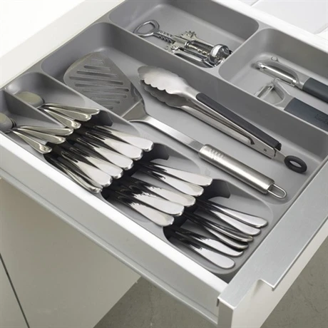 L’organiseur de tiroir DrawerStore™ optimise l’espace dans vos tiroirs. Il est doté d’espaces pour ranger les couverts et d’autres pour ranger les ustensiles et accessoires de cuisine. Sa grande taille et son design offrent beaucoup de possibilités. Les compartiments individuels à couverts permettent de les empiler plutôt que de les mettre côte à côte ce qui crée de l’espace.