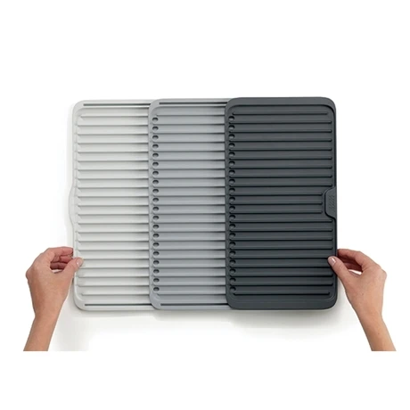 Le tapis de drainage extensible Joseph Joseph permet de sécher votre vaisselle n’importe : il récupère l’eau qu’il essore. Pour vider l’eau, un bec de drainage est intégré pour canaliser l’excès d’eau et verser directement dans l’évier. Le tapis de drainage offre une conception en 3 parties extensibles pour une plus grande capacité de drainage : la surface est idéale pour les tasses, les verres et les bols. Les nervures sont surélevées pour empêcher l’eau d’être piégée à l’intérieur des tasses, des verres etc. Rétractable, le tapis se replie pour un rangement facile.