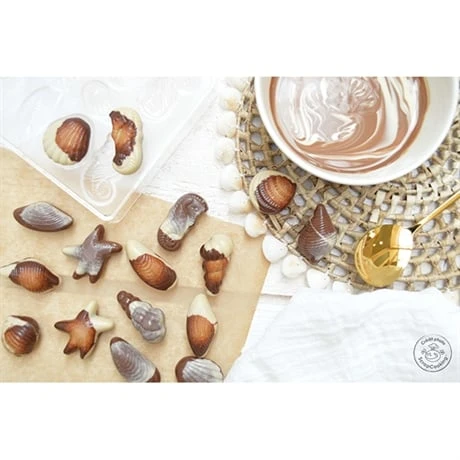 Après le tempérage de votre chocolat, placez-le dans vos moules rigides en PS pour obtenir de la friture sous forme de coquillages. Avec une plaque de 20 x 11 x 0,2 cm, vous obtenez 28 chocolats. Ce moule rigide Scrapcooking passe au réfrigérateur et au congélateur pour faire prendre votre chocolat. En revanche, il est incompatible avec le four et le lave-vaisselle.