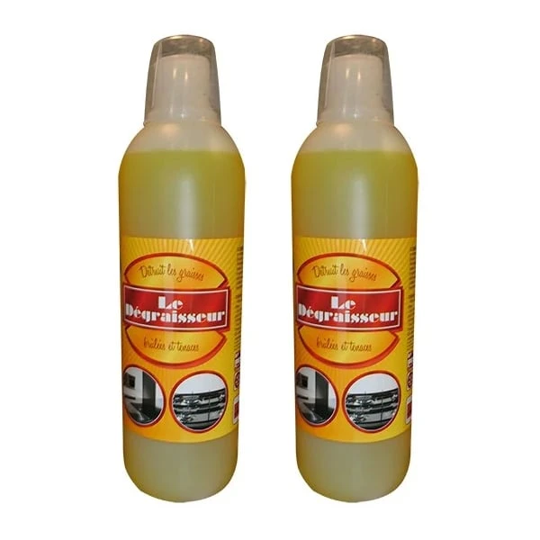 Ce lot comporte deux dégraisseurs de cuisine de 1L. Ce dégraisseur de cuisine détruit toutes les graisses brûlées et tenaces. Il dégraisse, nettoie, détache, rénove et fait briller toutes les surfaces lavables intérieures comme extérieures.