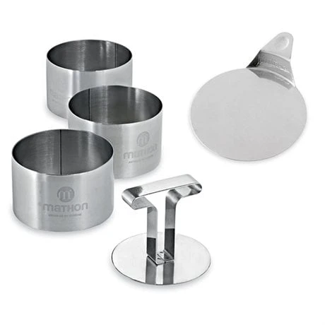 Les 3 cercles de présentation en inox avec poussoir Mathon sont idéals pour réaliser de parfaites préparations chaudes ou froides. En inox de qualité professionnelle, les 3 cercles de 7,8 cm de diamètre peuvent servir d’emporte pièces comme de moules. Le poussoir permet de démouler facilement vos préparations et conserver un résultat visuel parfait pour épater vos invités !