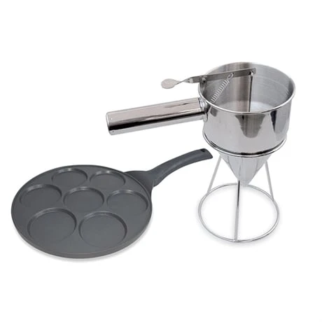 La poêle en fonte Mathon de 26,5 cm de diamètre est composée de 7 empreintes pour vous permettre de devenir le roi des pancakes et blinis. Ce lot avec l’entonnoir à piston Mathon Pro est parfait pour vous simplifier la tâche.