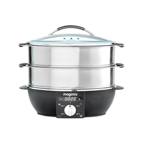 Si vous voulez cuire de très grandes quantités en gardant tous les nutriments possibles, optez pour le cuiseur vapeur multifonction 12,2 L 1900 W 11582 Magimix : avec une capacité maximale de 12,2 L et un système de chauffe à résistance ultra puissante, il vous offrira les meilleures performances possibles pour faire vos légumes, riz, poulets, rôtis… Choisissez un de ses 4 programmes, cuisson vapeur à 100°C pour la viande, les légumes le riz et les desserts, cuisson douce à 80°C pour les textures délicates comme le poisson, un maintien au chaud à 60°C pour les plats et une fonction 40°C spécialement faite pour fabriquer vos yaourts maison. Tout est fait pour vous simplifier l’accès, avec son bouton rotatif et son écran digital avec temps préprogrammé et arrêt automatique, ou le livre de plus de 50 recettes inclus. Et si vous voulez en découvrir plus, une application est disponible sur tablette et mobile, avec des tutos pour vous guider pas à pas.