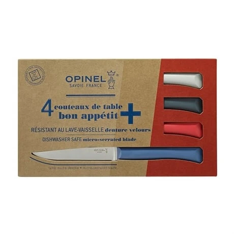 Le coffret 4 couteaux de table Bon Appétit+ proposé par Opinel est idéal pour un usage quotidien et une longue durée d’utilisation sans entretien. Résistants, ces couteaux disposent d’une lame de 11 cm en acier inoxydable dotée de micro denture pour une sensation de coupe sans déchirer. Pratique, le tranchant de ces couteaux ne nécessite aucun affûtage. Manche imperméable et résistant aux agents chimiques et à la chaleur, en polymère haut de gamme. Coloré, ce coffret comporte 4 couleurs différentes pour des tablées colorées : Bleu, rouge, anthracite et blanc.
