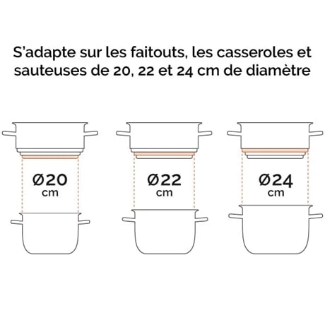 Pratique, il s’adapte sur les faitouts, casseroles et sauteuses de 20, 22 et 24 cm de diamètre.