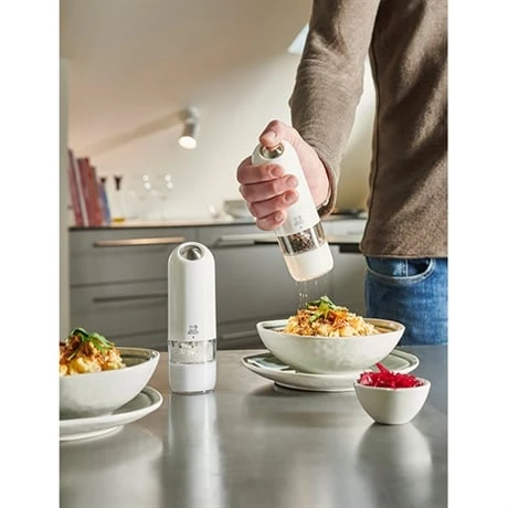 Design résolument contemporain pour ce lot de 2 moulins sel/poivre Alaska 17 cm à la fois ludique et vintage, avec sa forme galbée et ses boutons tout en rondeur. En plastique et métal pour un mélange harmonieux et ergonomique. Ingénieux, les moulins s’utilisent d’une seule main, une lampe à la base permet de contrôler le dosage, et un réservoir transparent indique le niveau de remplissage.