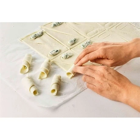 La roulette à croissant innovante va vous permettre de réaliser en un temps record de délicieux petits croissants garnis parfaits pour l’apéritifs ou le dessert ! De petites formes aux dimensions parfaites sont prédécoupés grâce à cette roue, et une petite empreinte ovale vous indique même à quel endroit déposer votre garniture pour que vos croissants soient une réussite à tous les coups. La roue découpe 20 petits triangles dans une pâte aux dimensions standards, que vous pourrez rouler individuellement après y avoir déposé vos garnitures. Vous pourrez laisser parler vos talents et confectionner des petits croissants salés pour vos apéritifs et entrée, mais également sucrés pour des desserts rapides et originaux. Fonctionnera avec toutes vos pâtes jusqu’à 2 mm d’épaisseur. En prime, un recueil de recettes de croissants sucrés et salés pour rester inspiré au quotidien.