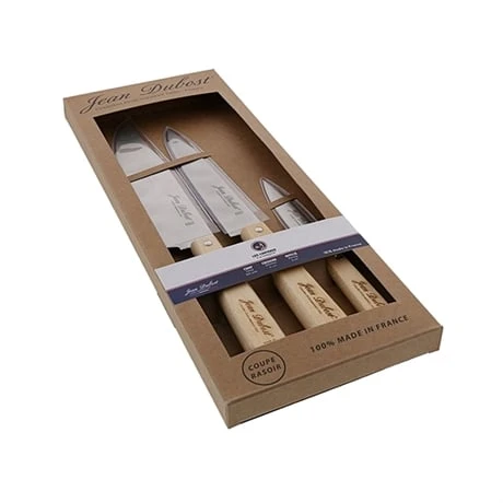 Cette gamme de couteaux de très belle qualité est conçue avec une lame en acier inoxydable, coupe rasoir, et un manche ergonomique, en hêtre naturel imprimé au laser. Synonyme d’un savoir-faire français traditionnel, le set 3 couteaux à la française est à 100% conçu et fabriqué à Thiers, pour un emploi local préservé et un impact carbone limité.