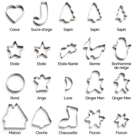 Ce set contient 20 formes différentes : 1 coeur, 1 sucre d’orge, 3 sapins, 3 étoiles, 1 renne, 1 bonhomme de neige, 1 rond, 1 ange, 1 lune, 2 bonhommes « ginger man », 1 maison, 1 cloche, 1 chaussette, 2 flocons.