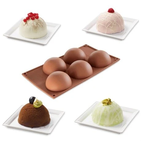 La plaque cinq demi-sphères vous permet de façonner vos desserts de toutes sortes. En silicone, ce moule garantit un démoulage facile, et est compatible avec une utilisation de -60° à +230°. Vous pouvez ainsi réaliser crèmes glacées, entremets, mousses et gâteaux en forme de demi-sphères nettes de 8 centimètres de diamètre.